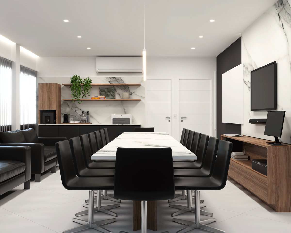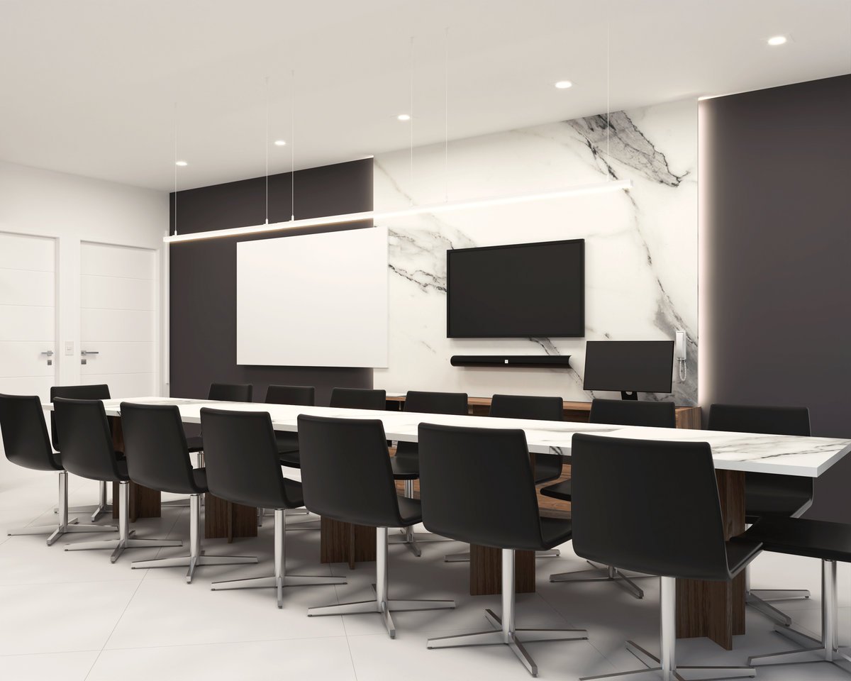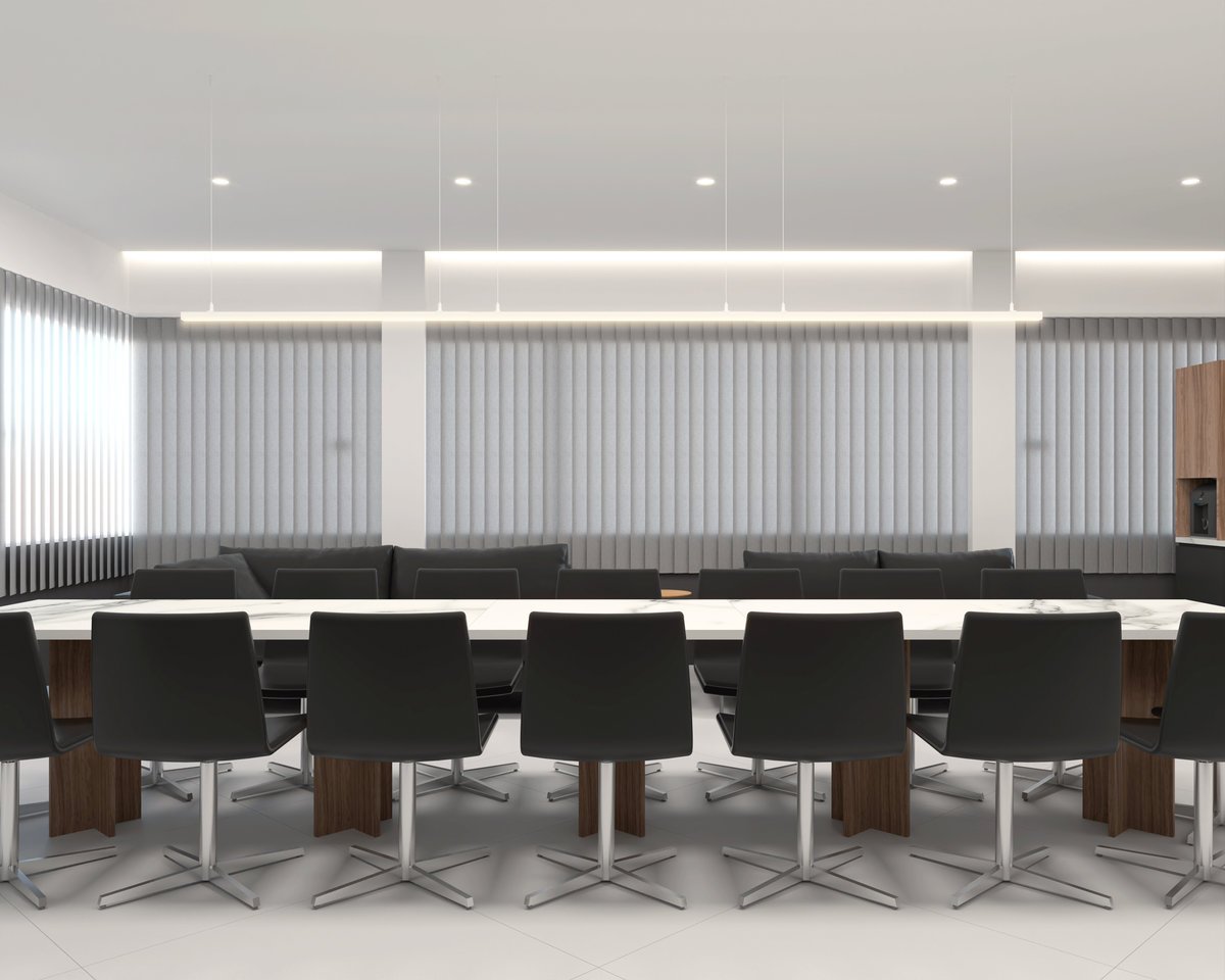 Para atender equipes multifuncionais, criamos uma sala de reuniões com módulos de mesas móveis, que se juntam para grandes encontros ou se separam para workshops e brainstorms menores. Aproveitamos os sofás e cadeiras que eles já tinham, porque sempre buscamos usar os recursos disponíveis de forma inteligente, valorizando ao máximo o investimento do cliente. A paleta preto-e-branco reforça o caráter corporativo e sério e a iluminação foi distribuída para evitar sombras e manter o foco nos participantes. Esse projeto prova que flexibilidade e elegância não são opostos: podem andar juntas para garantir produtividade e versatilidade em cada reunião.