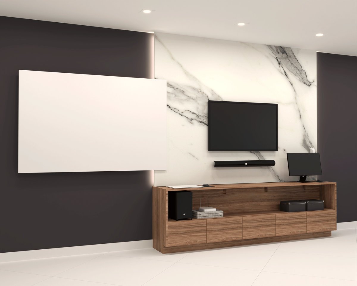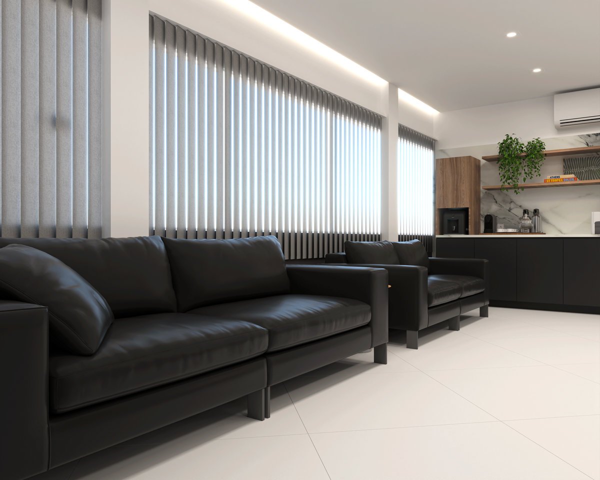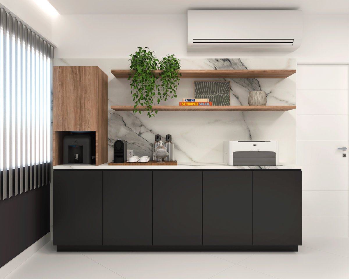 Para atender equipes multifuncionais, criamos uma sala de reuniões com módulos de mesas móveis, que se juntam para grandes encontros ou se separam para workshops e brainstorms menores. Aproveitamos os sofás e cadeiras que eles já tinham, porque sempre buscamos usar os recursos disponíveis de forma inteligente, valorizando ao máximo o investimento do cliente. A paleta preto-e-branco reforça o caráter corporativo e sério e a iluminação foi distribuída para evitar sombras e manter o foco nos participantes. Esse projeto prova que flexibilidade e elegância não são opostos: podem andar juntas para garantir produtividade e versatilidade em cada reunião.